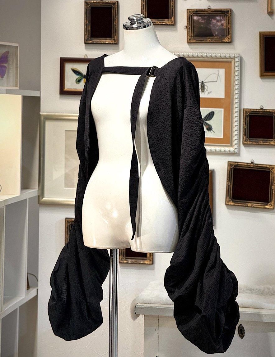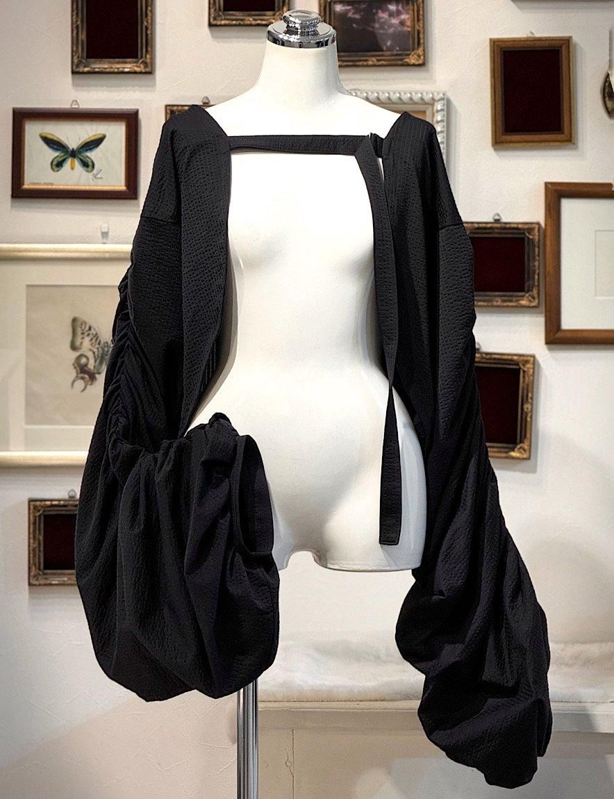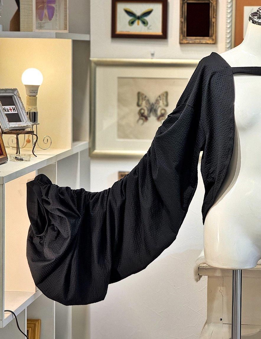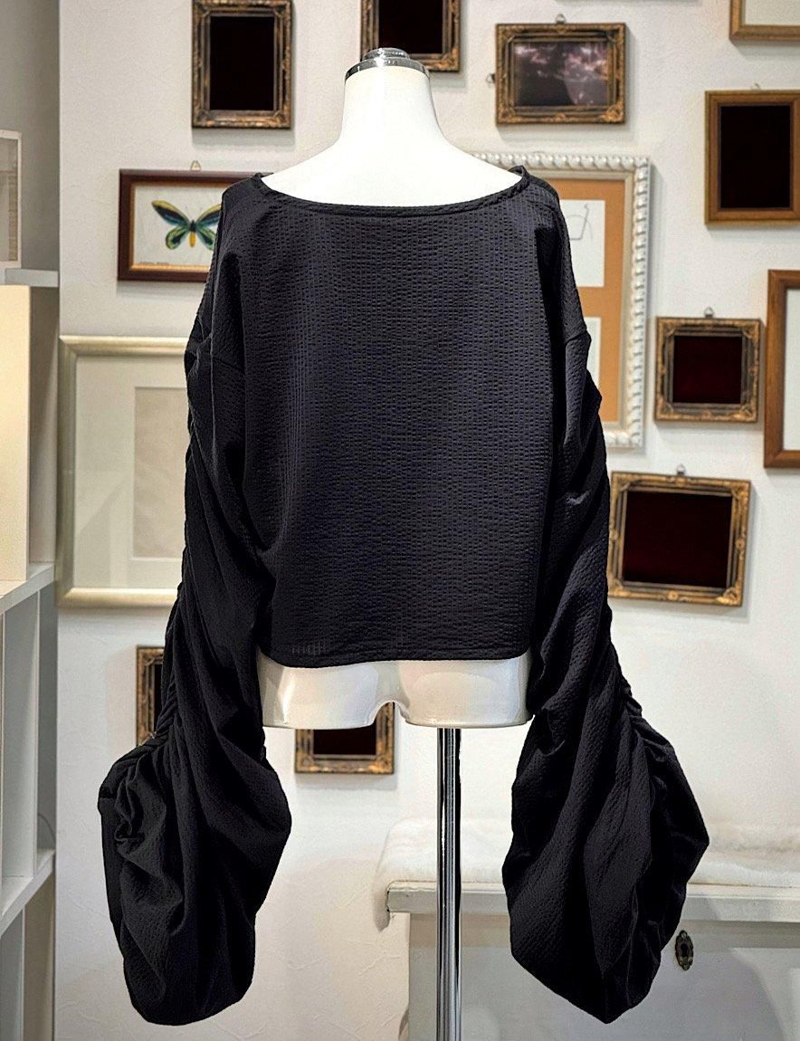 幅広く取った袖はドロスト仕様でよりボリューム感を