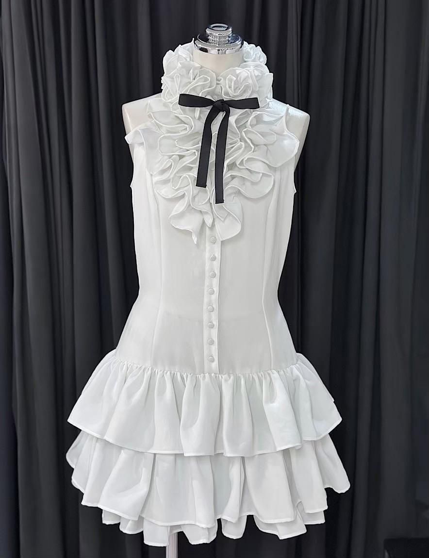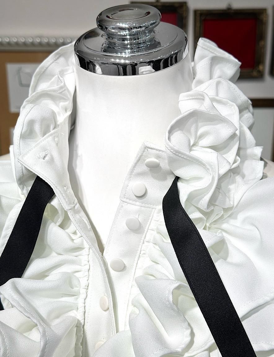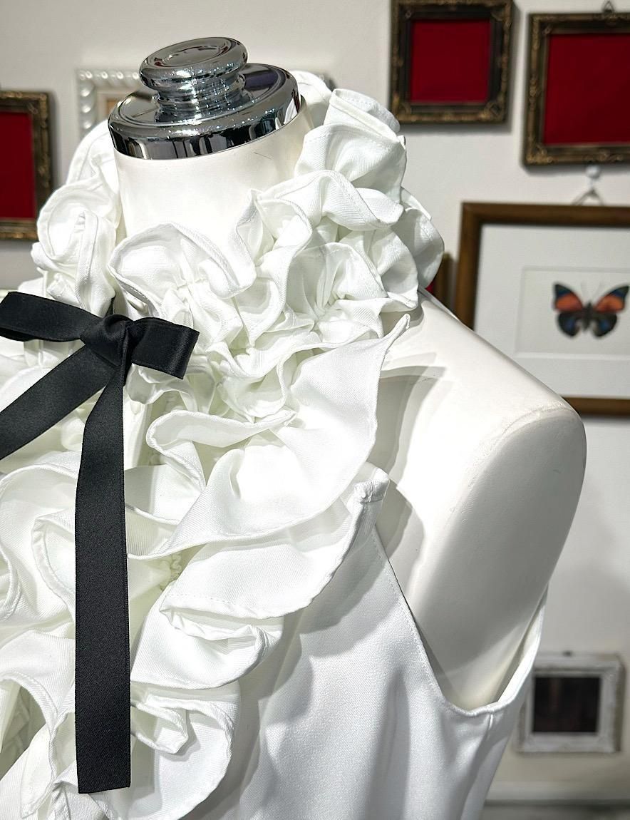 首から胸元にかけてふんだんにフリルをあしらったデザインながらもアメリカンスリーブのカットですっきりとした印象に